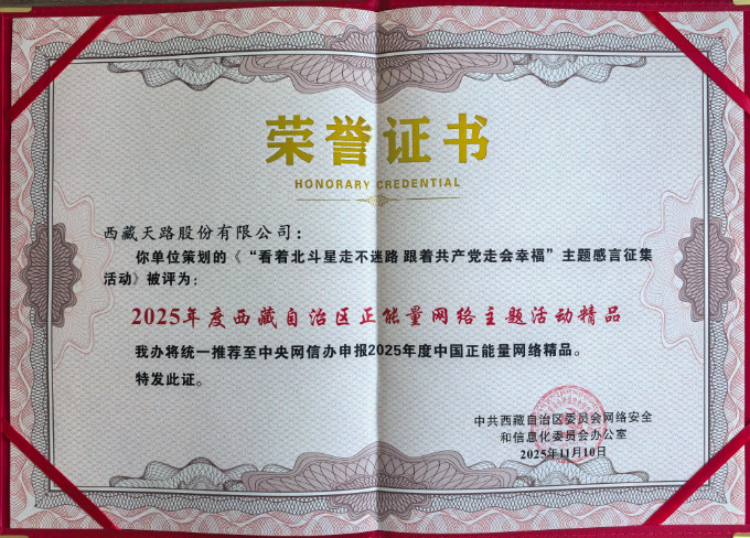 企宣部策劃的文字作品《看著北斗星走不迷路 跟著共產黨走會幸福|西藏天路干部職工熱議習近平總書記重要回信精神》憑借深刻的主題和真摯的情感,榮膺“2025年度西藏自治區(qū)正能量網絡主題活動精品獎”。