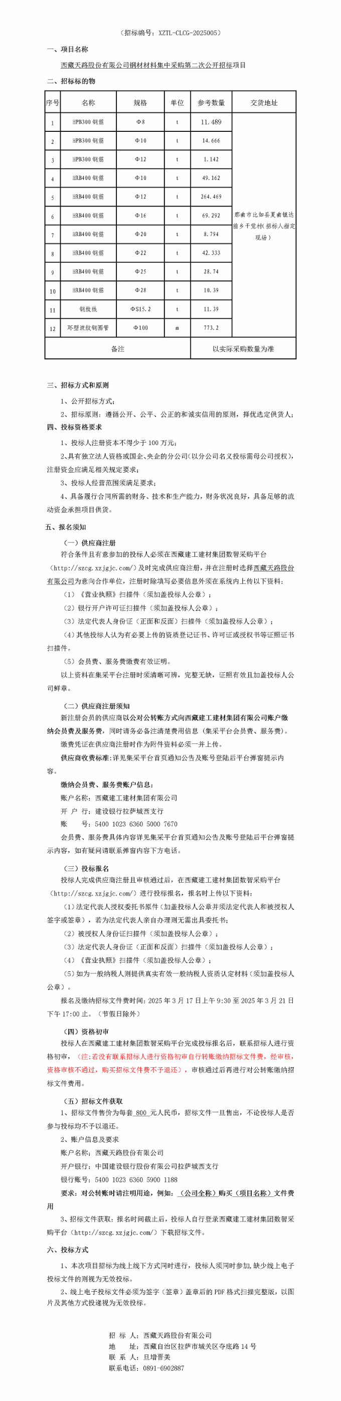西藏天路股份有限公司鋼筋材料公開(kāi)招標(biāo)招標(biāo)公告