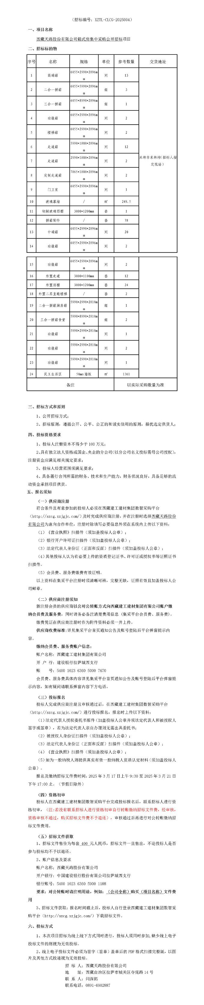 點(diǎn)擊量:7113(招標(biāo)編號(hào):XZTL-CLCG-2025006) 一、項(xiàng)目名稱 西藏天路股份有限公司鋼筋材料集中采購公開招標(biāo)項(xiàng)目 二、招標(biāo)標(biāo)的物 序號(hào) 名稱 規(guī)格 單位 參考數(shù)量 交貨地址 1 鋼筋HRB400E Φ6 T 2 西藏自治區(qū) 那曲市市內(nèi) 2 鋼筋HRB400E Φ8 T 4 3 鋼筋HRB400E Φ10 T 3 4 鋼筋HRB400E Φ12 T 12 5 鋼筋HRB400E Φ14 T 12 6 鋼筋HRB400E Φ16 T 12 7 鋼筋HRB400E Φ18 T 12 8 圓鋼HPB300 Φ8 T 240 合計(jì) 297 備注 以實(shí)際采購數(shù)量為準(zhǔn) 三、招標(biāo)方式和原則 1、公開招標(biāo)方式; 2、招標(biāo)原則:遵循公開、公平、公正的和誠(chéng)實(shí)信用的原則,擇優(yōu)選定供貨人; 四、投標(biāo)資格要求 1、投標(biāo)人注冊(cè)資本不得少于100萬元; 2、具有獨(dú)立法人資格或國(guó)企、央企的分公司(以分公司名義投標(biāo)需母公司授權(quán)),注冊(cè)資金應(yīng)滿足相關(guān)規(guī)定要求; 3、投標(biāo)人經(jīng)營(yíng)范圍須滿足要求; 4、具備履行合同所需的財(cái)務(wù)、技術(shù)和生產(chǎn)能力,財(cái)務(wù)狀況良好,具備足夠的流動(dòng)資金承擔(dān)項(xiàng)目供貨。 五、報(bào)名須知 (一)供應(yīng)商注冊(cè)(已注冊(cè)成功的可直接登錄平臺(tái)投標(biāo)報(bào)名) 符合條件且有意參加的投標(biāo)人必須在西藏建工建材集團(tuán)數(shù)智采購平臺(tái)(http://szcg.xzjgjc.com/)及時(shí)完成供應(yīng)商注冊(cè),并在注冊(cè)時(shí)選擇西藏天路股份有限公司為意向合作單位,注冊(cè)時(shí)除填寫必要信息外須在系統(tǒng)內(nèi)上傳以下資料: (1)《營(yíng)業(yè)執(zhí)照》掃描件(須加蓋投標(biāo)人公章); (2)銀行開戶許可證掃描件(須加蓋投標(biāo)人公章); (3)法定代表人身份證(正面和反面)掃描件(須加蓋投標(biāo)人公章); (4)其他投標(biāo)人認(rèn)為有必要上傳的資質(zhì)登記證書、許可證或授權(quán)書等證照證書掃描件。 以上資料在集采平臺(tái)注冊(cè)時(shí)須清晰可辨,完整無缺,證照有效且加蓋投標(biāo)人公司鮮章。 (二)供應(yīng)商注冊(cè)須知 愿意加入西藏建工建材集團(tuán)數(shù)智采購平臺(tái)供應(yīng)商庫并且有意愿投標(biāo)的的企業(yè),需繳納平臺(tái)會(huì)員費(fèi)及服務(wù)費(fèi),各供應(yīng)商繳費(fèi)時(shí)務(wù)必備注清楚繳費(fèi)信息 (集采平臺(tái)會(huì)員費(fèi)、服務(wù)費(fèi))與繳費(fèi)單位信息,注冊(cè)時(shí)在相應(yīng)位置上傳繳費(fèi)憑證以及相應(yīng)資審文件成為新供應(yīng)商。 供應(yīng)商入駐平臺(tái)收費(fèi)標(biāo)準(zhǔn)及繳費(fèi)賬戶信息:具體內(nèi)容詳見集采平臺(tái)首頁通知公告及平臺(tái)彈窗提示。 賬戶名稱:西藏建工建材集團(tuán)有限公司 開 戶 行:建設(shè)銀行拉薩城西支行 賬 號(hào):5400 1023 6360 5000 7670 (三)投標(biāo)報(bào)名 投標(biāo)人完成供應(yīng)商注冊(cè)且審核通過后,在西藏建工建材集團(tuán)數(shù)智采購平臺(tái)(http://szcg.xzjgjc.com/)進(jìn)行投標(biāo)報(bào)名,報(bào)名時(shí)上傳以下資料: (1)法定代表人授權(quán)委托書原件(加蓋投標(biāo)人公章并須法定代表人和被授權(quán)人簽字或簽章),若為法定代表人親自辦理則無需出具委托書; (2)被授權(quán)人身份證掃描件(須加蓋投標(biāo)人公章); (3)法定代表人身份證(正面和反面)掃描件(須加蓋投標(biāo)人公章); (4)《營(yíng)業(yè)執(zhí)照》掃描件(須加蓋投標(biāo)人公章); (5)如為一般納稅人則提供真實(shí)有效一般納稅人資質(zhì)認(rèn)定材料(須加蓋投標(biāo)人公章)。 報(bào)名及繳納招標(biāo)文件費(fèi)時(shí)間:2025年3月28日上午9:30至2025年4月3日下午17:30止。(節(jié)假日除外) (四)資格初審 投標(biāo)人在西藏建工建材集團(tuán)數(shù)智采購平臺(tái)完成投標(biāo)報(bào)名后,聯(lián)系招標(biāo)人進(jìn)行資格初審,(注:若沒有聯(lián)系招標(biāo)人進(jìn)行資格初審自行轉(zhuǎn)賬繳納招標(biāo)文件費(fèi),經(jīng)審核,資格審核不通過,購買招標(biāo)文件費(fèi)不予退還),審核通過后再進(jìn)行對(duì)公轉(zhuǎn)賬繳納招標(biāo)文件費(fèi)用。 (五)招標(biāo)文件獲取 招標(biāo)文件售價(jià)為每套 400 元人民幣,招標(biāo)文件一旦售出,不論投標(biāo)人是否參與投標(biāo)均不予以退還。 賬戶信息及要求 賬戶名稱;西藏天路股份有限公司 開戶銀行:中國(guó)建設(shè)銀行股份有限公司拉薩城西支行 銀行賬號(hào):54001023636059001188 要求:對(duì)公轉(zhuǎn)賬時(shí)請(qǐng)注明用途,例如:(公司全稱)購買(項(xiàng)目名稱)文件費(fèi)用 3、招標(biāo)文件獲取:報(bào)名時(shí)間截止后,投標(biāo)人自行登錄西藏建工建材集團(tuán)數(shù)智采購平臺(tái)(http://szcg.xzjgjc.com/)下載招標(biāo)文件。 六、投標(biāo)方式 1、本次項(xiàng)目招標(biāo)為線上線下方式同時(shí)進(jìn)行,投標(biāo)人須同時(shí)參加,缺少線上電子投標(biāo)文件的則視為無效投標(biāo)。 2、線上電子投標(biāo)文件必須為簽字蓋章后的PDF格式掃描完整版,以圖片及其他方式投遞視為無效投標(biāo)。 招 標(biāo) 人:西藏天路股份有限公司 地 址:西藏自治區(qū)拉薩市城關(guān)區(qū)奪底路14號(hào) 聯(lián) 系 人:成 鳳 聯(lián)系電話:0891-6902887